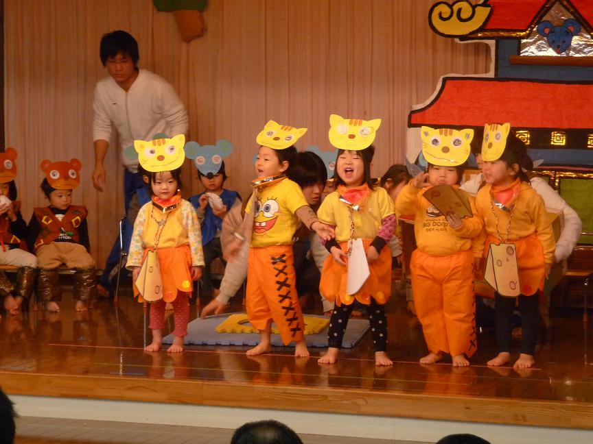 陸のクラスはみんなでいろんな動物になっておむすびころりんをやりました。陸はねこさん役。とってもかわいかったです