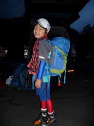 今年買った本格的な登山かばんには、自分の食糧、着替えを、おやつを入れて、ハイドロキューブに、ストックを装備してすっかり登山家です。今年で白山登山2回目の陸はなんだか余裕を感じさせる立ち姿。かっこいい