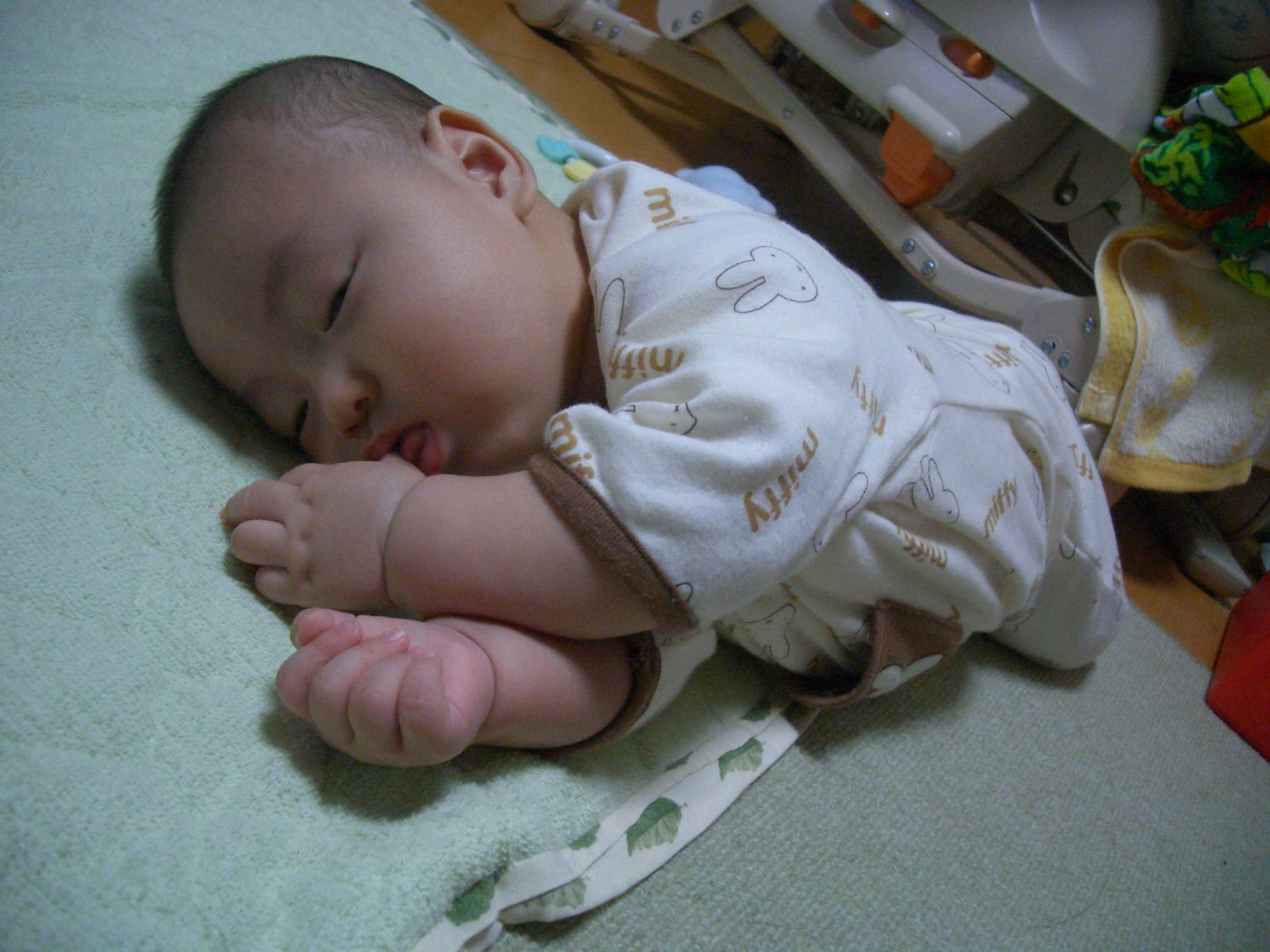 寝返りしたまま泣いて疲れ果てて寝てしまった状態。