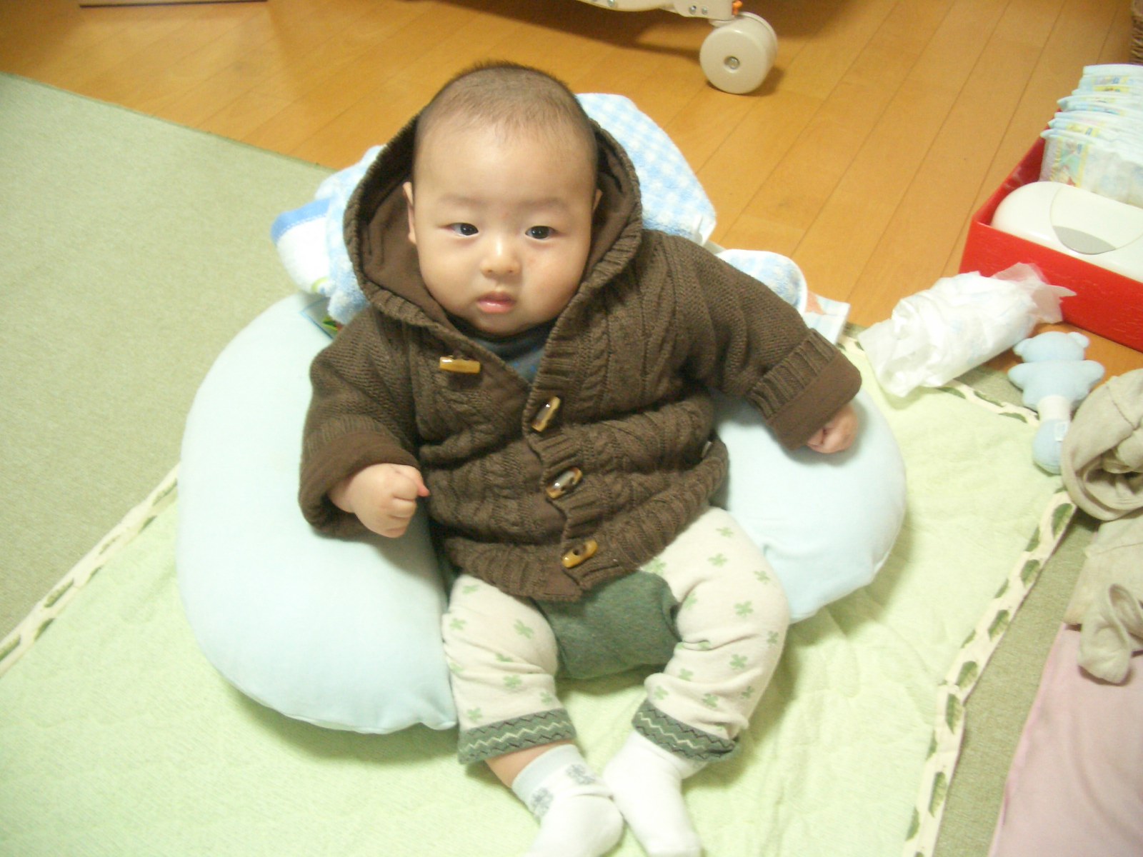 寒いので陸もしっかり厚着させておでかけです。お祝いでもらったニットのパーカーがもこもこでかわいい