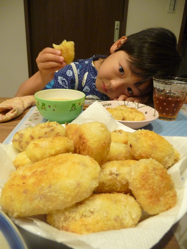 夕食はコロッケ。みんなで丸めて作りました。 陸もいっぱい食べましたよ 美味しかったね。 やっぱり手作りは美味しいね。