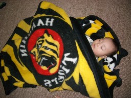 タイガース毛布にくるまれてお昼寝 連休中は歩行器にのれなかったからか、はいはいの練習いっぱいできました。お尻をぷくってあげて足を動かせていたのでもう少しでできるようになるかなー。